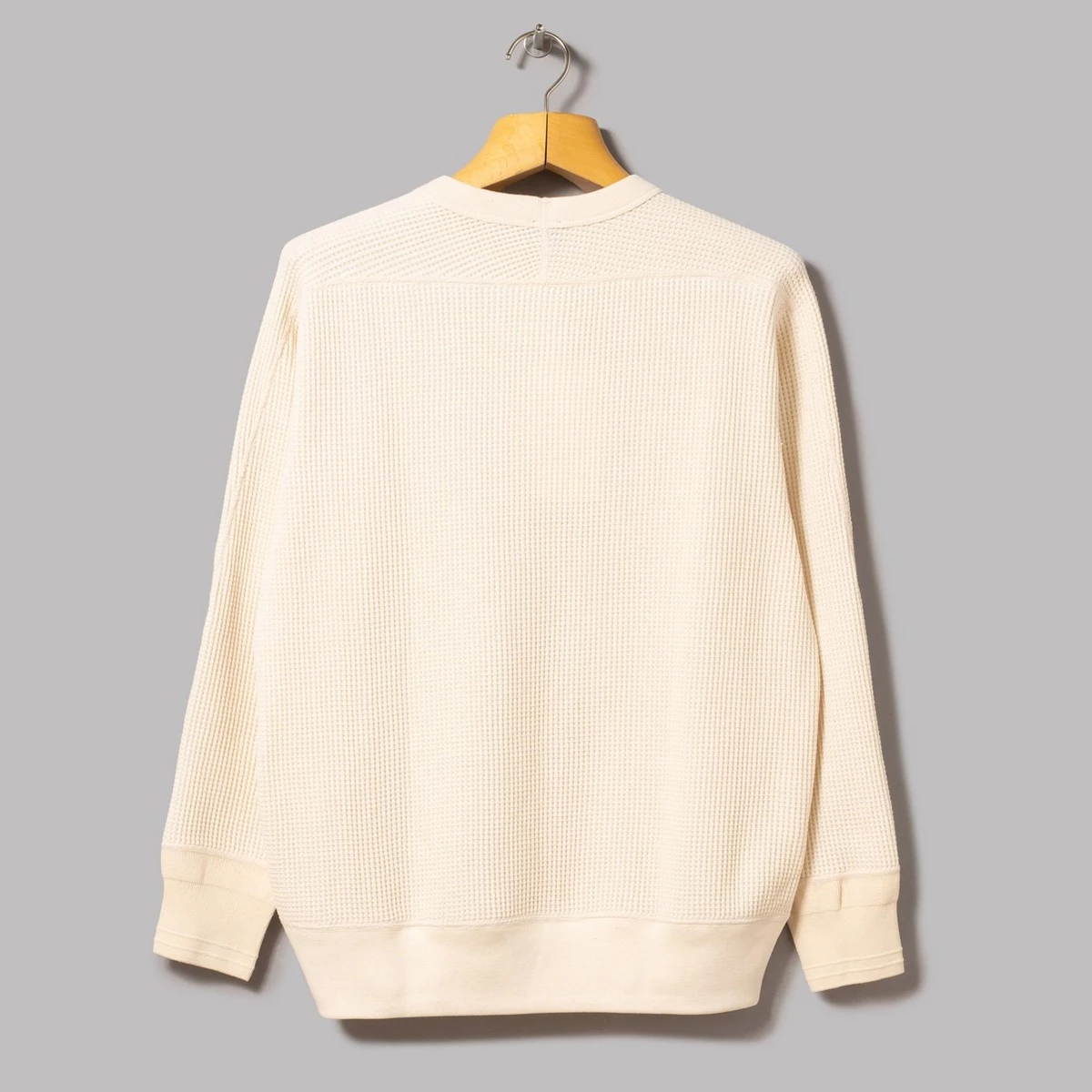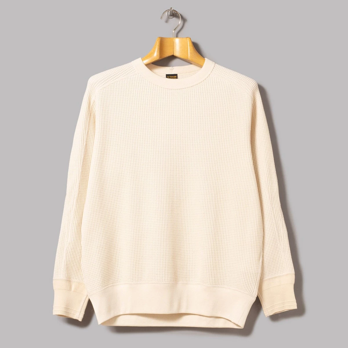 100% cotton. Waffle knit fabric. Raglan sleeves. Ribbed collar, cuffs and hem. Made in Japan. Regular fit.
