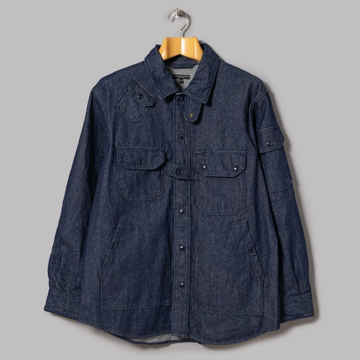100% cotton. Lightweight twill fabric. Full button fastening. Buttoned neck and chest tabs. Two chest pockets with buttoned flaps. Buttoned cuffs. Two slash pockets. One front patch pocket with buttoned flaps. Two front stash pockets with buttoned flaps. Two patch pockets on back. Curved hem. Made in USA. Regular fit. Just when you think youve gotten your head round Engineered Garments, they throw something like this Explorer Shirt Jacket directly into your retinas and youre once again left not knowing which way is up. With more pockets and buttons than any sane man will know what to do with, theres a strong utility vibe about this, which is only enforced by that extremely-thought-provoking lightweight twill fabric.