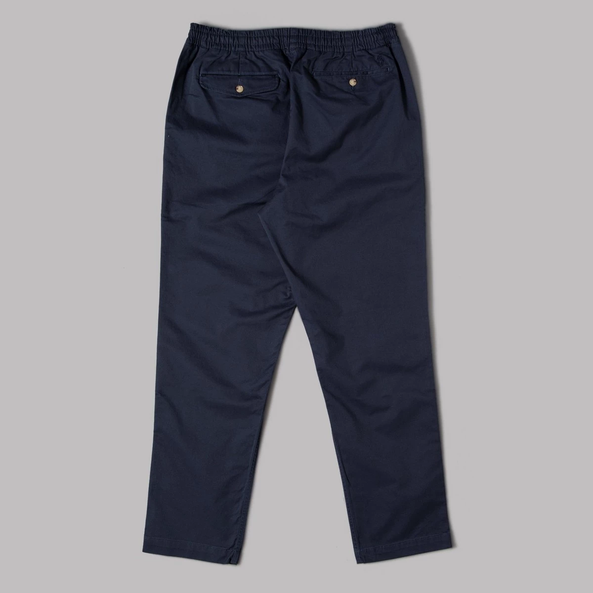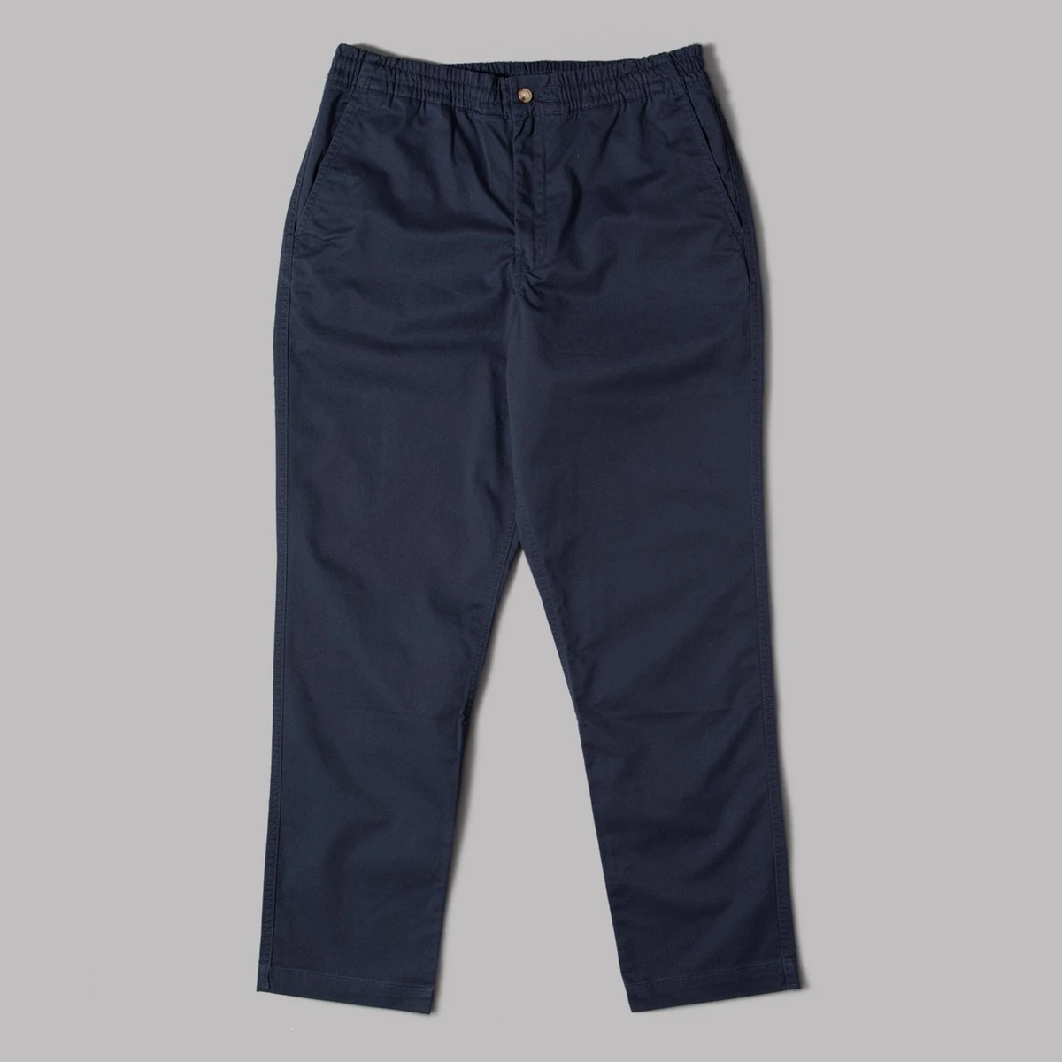 97% cotton, 3% elastane. Chino fabric. Zip fly with button fastening. Elasticated waist. Four pockets. Relaxed fit. Tapered leg.